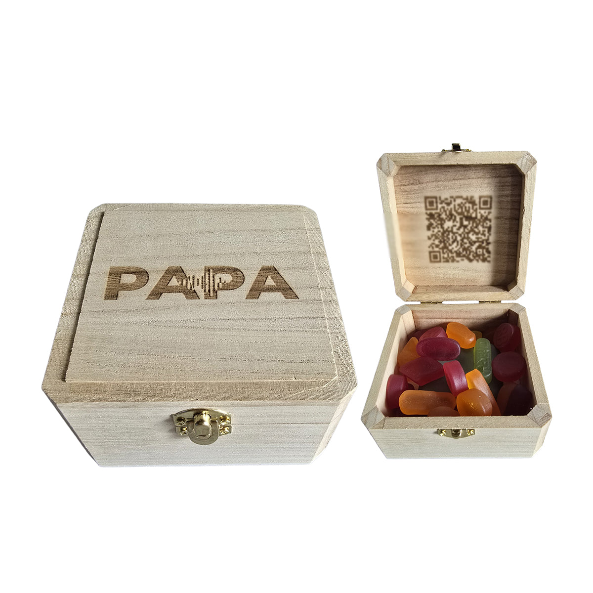Voor Vaderdag maakten we dit houten doosje met de gravure PAPA. Op zichzelf al een mooi en persoonlijk cadeau. Maar de echte verrassing zat vanbinnen: een QR-code met een spraakbericht. Zodra papa het doosje opende en de code scande, hoorde hij een persoonlijke boodschap. Een cadeautje dat niet alleen leuk is om te krijgen, maar ook een herinnering om te bewaren.