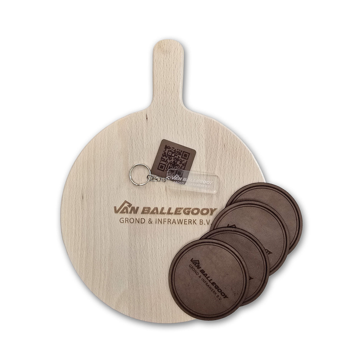Voor van Ballegooy Grond & Infrawerk maakten we deze set met borrelplank, onderzetters en sleutelhanger.